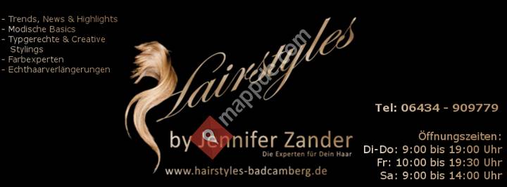 Das Motto von Hairstyles by Jennifer Zander lautet: „ Die Experten für Dein Haar!“ und ist die Firmenphilosophie, die die tägliche Arbeit im Salon lenkt. Der Aufenthalt soll für den Kunden Verwöhnzeit sein, und der Kunde steht zu jeder Zeit im Mittelpunkt und an erster Stelle.