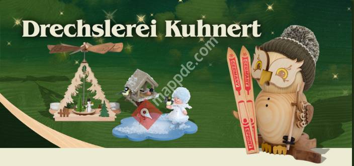 "Unsere Holzkunst Kuhnert Filiale bietet eine große Auswahl an Geschenk- und Dekoartikeln von verschiedene Holzfiguren, Rauchfiguren, Pyramiden, Lichterbögen, Engel, Osterhasen, Laternen, Teelichthalter, Bastelsets für Kinder, Baum- und Straußschmuck, Leuchten bis andere Dekorationsartikel.Durch die Anbindung an unsere Produktion bieten wir auch vor Weihnachten und Ostern Märkte an, wo man sie die Herstellung unserer Produkte anschauen und auch selbst Bastelsets basteln kann."hinzufügen eines Holzkunst Kuhnert-stadtplans zu ihrer webseite;